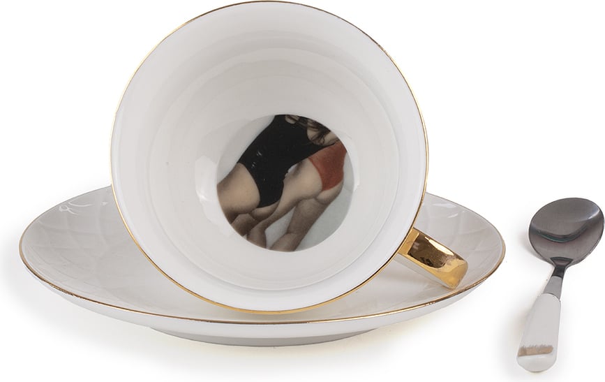 Ova naizgled obična, ali elegantna šalica iznenađuje svojim zavodljivim dnom… Porculanska Lady Tarin marke Seletti dostupna je u kompletu s tanjurićem i žličicom. Samo pazite da se ne zagrcnete čajem kad ugledate dno!